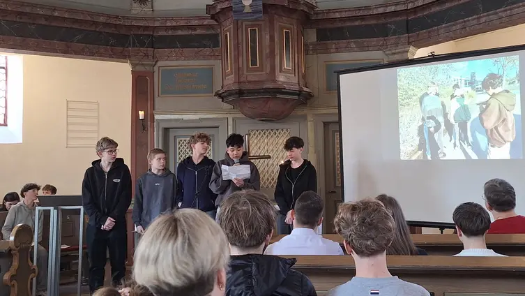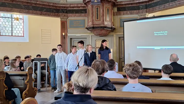 Die ‚Predigt‘ war dann ganz besonders: Die Konfis hatten sich intensiv mit der Geschichte der Jünger befasst, die auf dem Weg nach Emmaus dem auferstandenen Jesus begegnen, ihn aber erst nach einem langen Tag am Abend beim Brechen des Brotes erkennen, und spielten sie nach. Dann gab es noch die Frauen, die Jesus’ Leichnam salben wollten und ihn nicht vorfanden. Die Video-Szenen wurden im Freien und in der Unterkunft gefilmt: Das leere Grab – ein Zimmer mit geöffneter Tür. Unter der Bettdecke fanden „die Marias“ einen Engel, der ihnen vom auferstandenen Jesus erzählte. Und schon stand dieser in der Türe und forderte die Frauen auf, schnell ins Dorf zu laufen und die Botschaft von der Auferstehung weiterzugeben. Szenenwechsel. Die beiden Marias (von Jungs gespielt) nahmen die Beine in die Hand, rennen ins Dorf, treffen auf andere, erzählen das Erlebte und laufen gemeinsam weiter. So verbreitet sich die Kunde vom Auferstandenen. Der Erzähler kommt ins Bild, die Bibel wird hörbar zugeklappt. ENDE. Aufbrausender Applaus, so wurde die Auferstehungsgeschichte in der Nauroder Kirche noch nie erzählt.