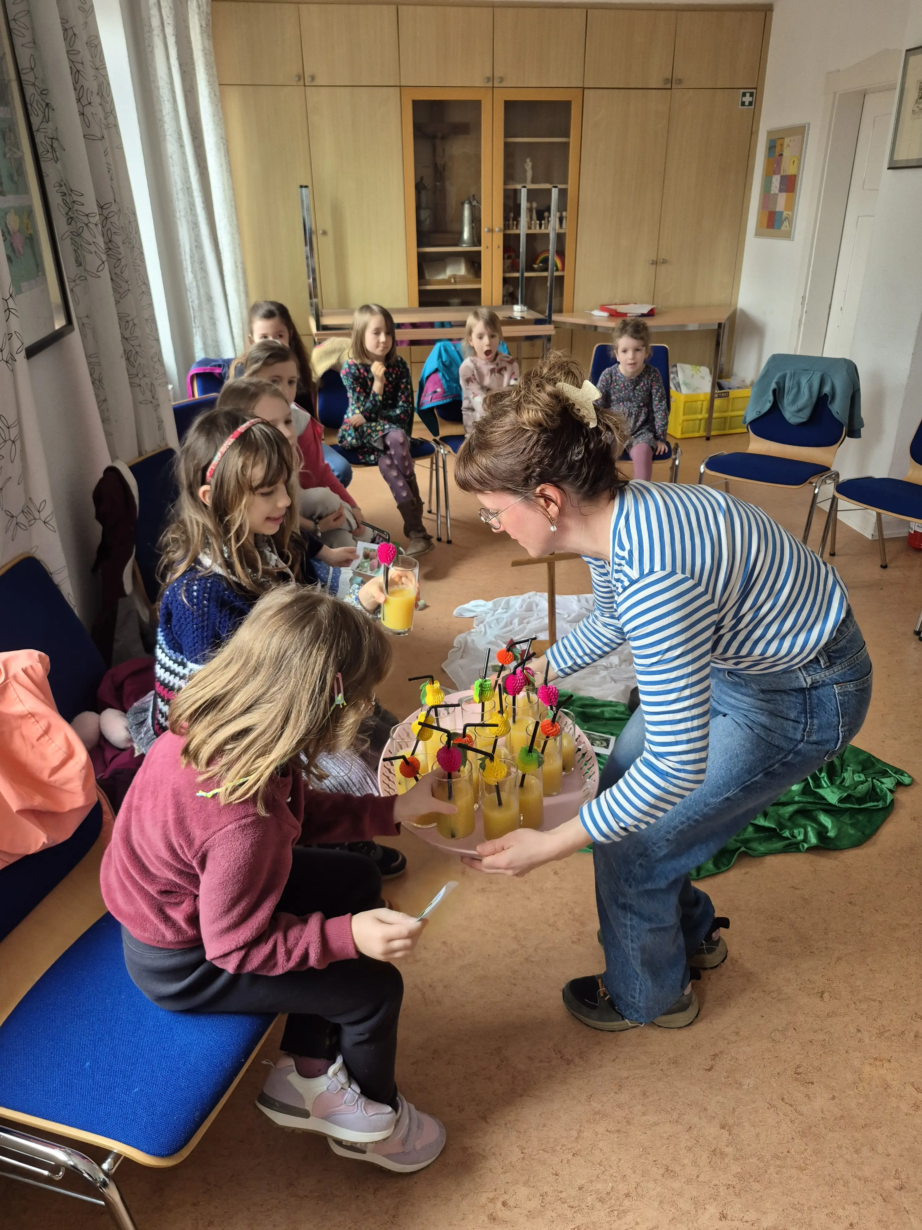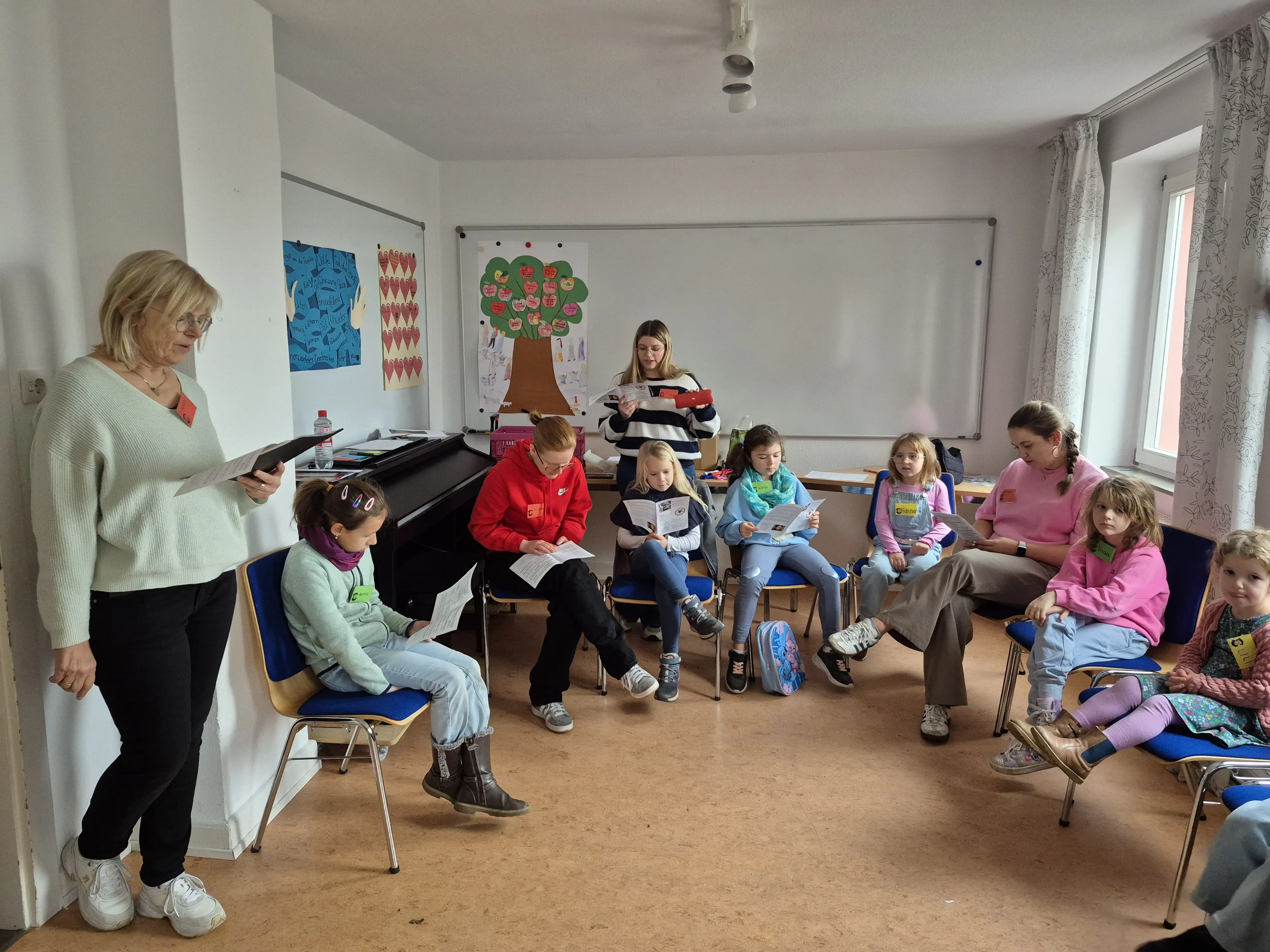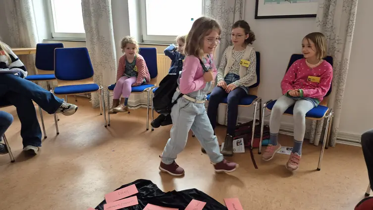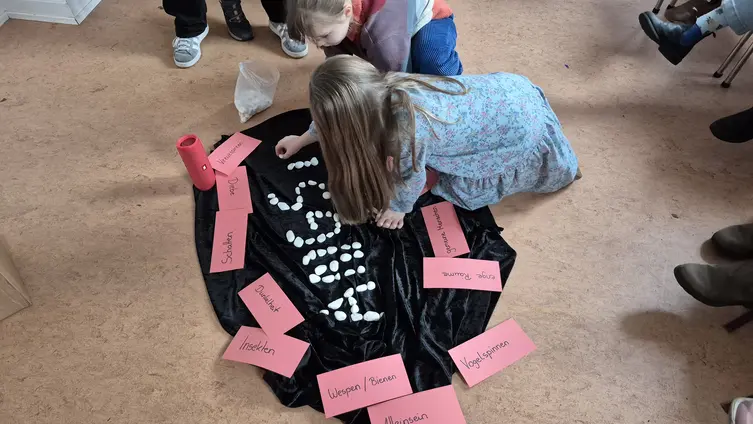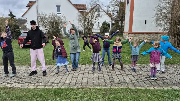 Besonders Spaß hatten die Kinder bei einem anschaulichen Spiel: Die Kinder stellten Samen dar, die zunächst regungslos auf der Erde lagen. Durch „Regen“ und „Sonne“ – dargestellt mit Bewegungen und Geräuschen – begannen die Samen zu wachsen, bis schließlich bunte Blumen aus ihnen wurden. So konnten die Kinder spielerisch erleben, was die Jahreslosung bedeutet: Gott schenkt neues Leben und lässt Neues entstehen.