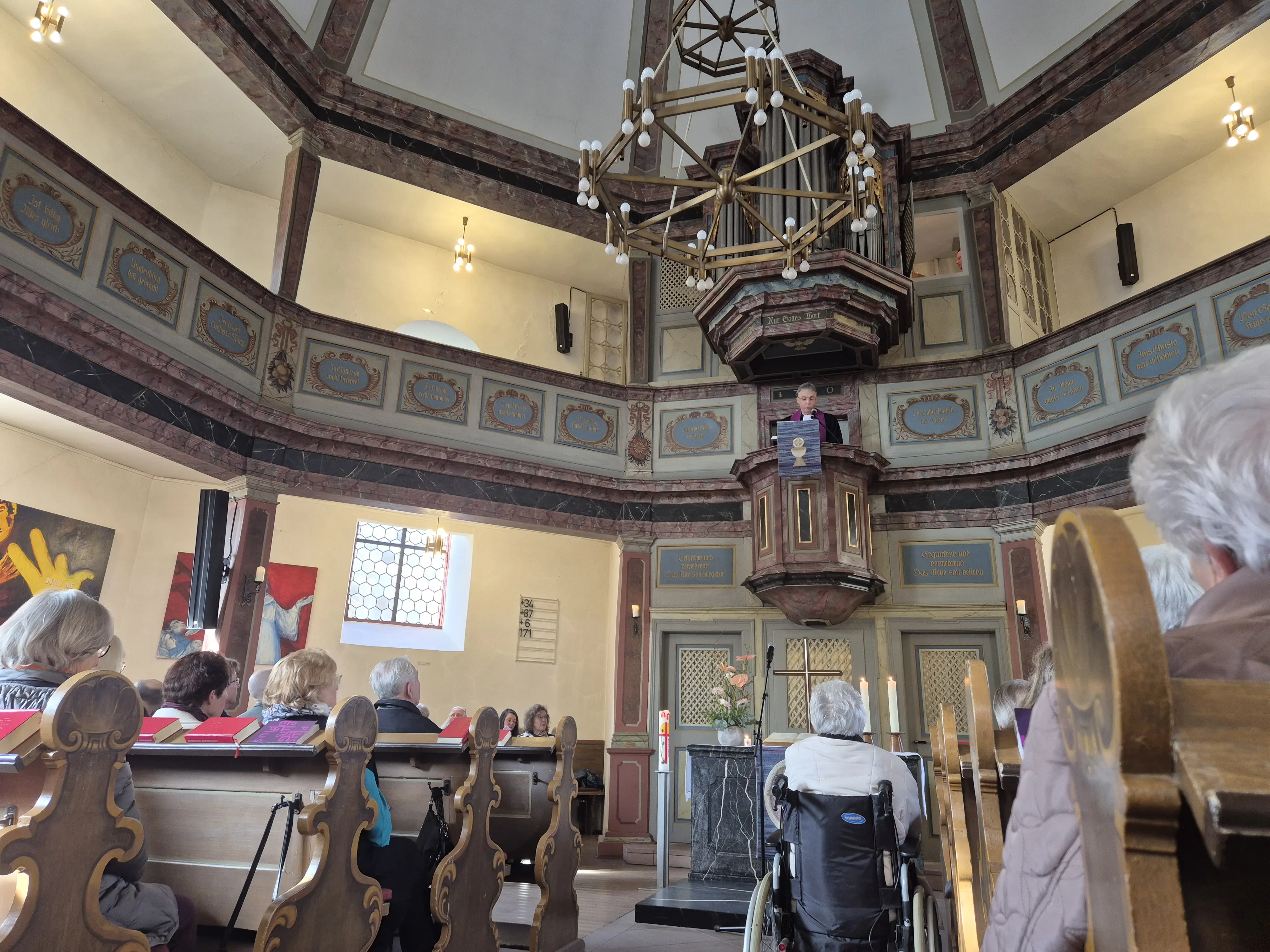 Anschließend ging’s über die Autobahn nach Idstein, zuerst in ein geräumig-gemütliches Café und zu guter Letzt zu einer engagierten Führung durch ein ehemaliges Kirchenvorstandsmitglied in die große, barockschmucke, evangelische Unionskirche. Deren Entstehung sei auf den Nassauischen Fürsten Georg August Samuel (lutherisch) und seiner Frau Henriette Dorothea (reformiert) im achtzehnten Jahrhundert zurückzuführen .