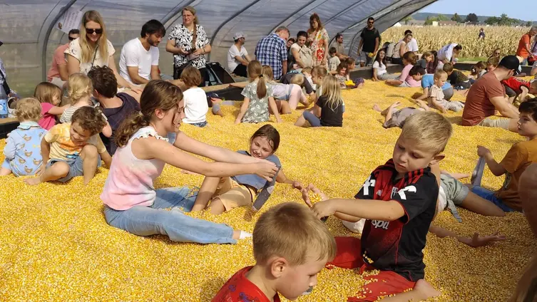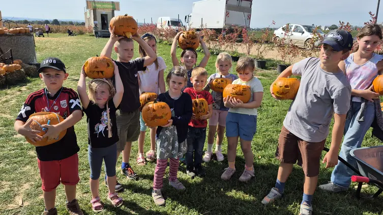 Noch vor dem Mittagessen wollten die Kinder dann das riesige Hüpfkissen und das Maisschwimmbad ausprobieren. Da es ziemlich voll war, mussten die drei Betreuerinnen gut aufpassen, um alle Kinder im Blick zu behalten. Zum Mittagessen hatten sich die Kinder Mailkolben, Pommes oder Würstchen im Brötchen ausgesucht und ließen es sich nach dem Tischgebets-Rap gut schmecken. Nach 3,5 Stunden präsentierten die Kinder den abholenden Eltern stolz ihre Kürbisse und waren sich einig, dass sie viel Spaß im Maislabyrinth hatten.