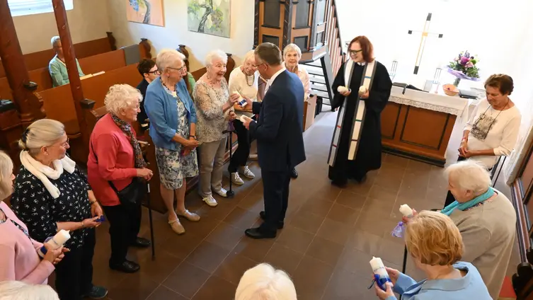 Alle anwesenden Damen erhielten zum Jubiläum, neben der Urkunde für die Gruppe, eine Kerze mit dem Logo der Ev. Frauen der EKHN und eine Kette mit dem Facettenkreuz überreicht.