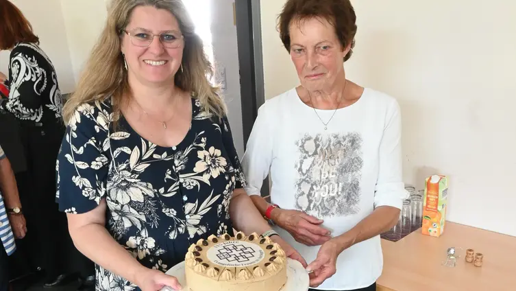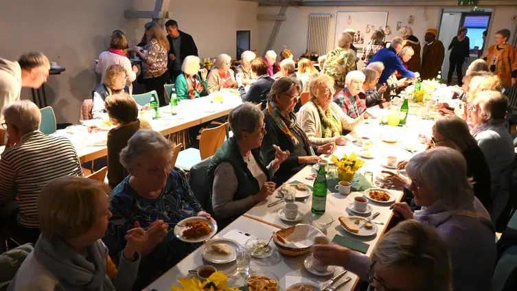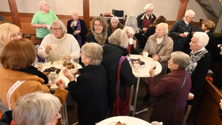 Nach dem Gottesdienst haben die Evangelischen Frauen und die anderen Gottesdienstbesucher bei Sekt, Kaffee und Kuchen ihr Jubiläum in der Ortsverwaltung Auringen gefeiert. Eine besondere kulinarische Überraschung war eine von Frau Brack hergestellte Mokkatorte mit essbarem Logo der Ev. Frauen. (SH)