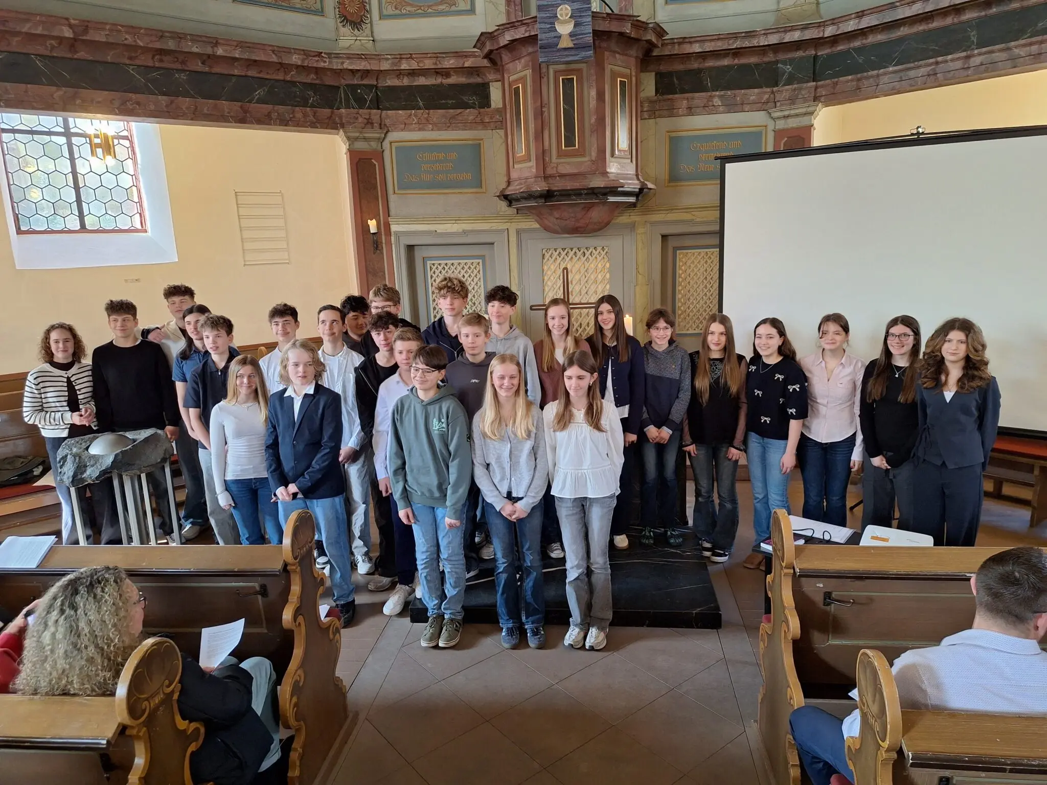 Nach einem gemeinsamen Foto am Altar dankte Pfarrer Tschöpel allen im Hintergrund beteiligten Helferinnen und Helfern, der Gottesdienst war ein echtes Gemeinschaftsprojekt… Im Anschluss wurden noch zwei Konfis getauft, das übernahm dann doch einer der Pfarrer!