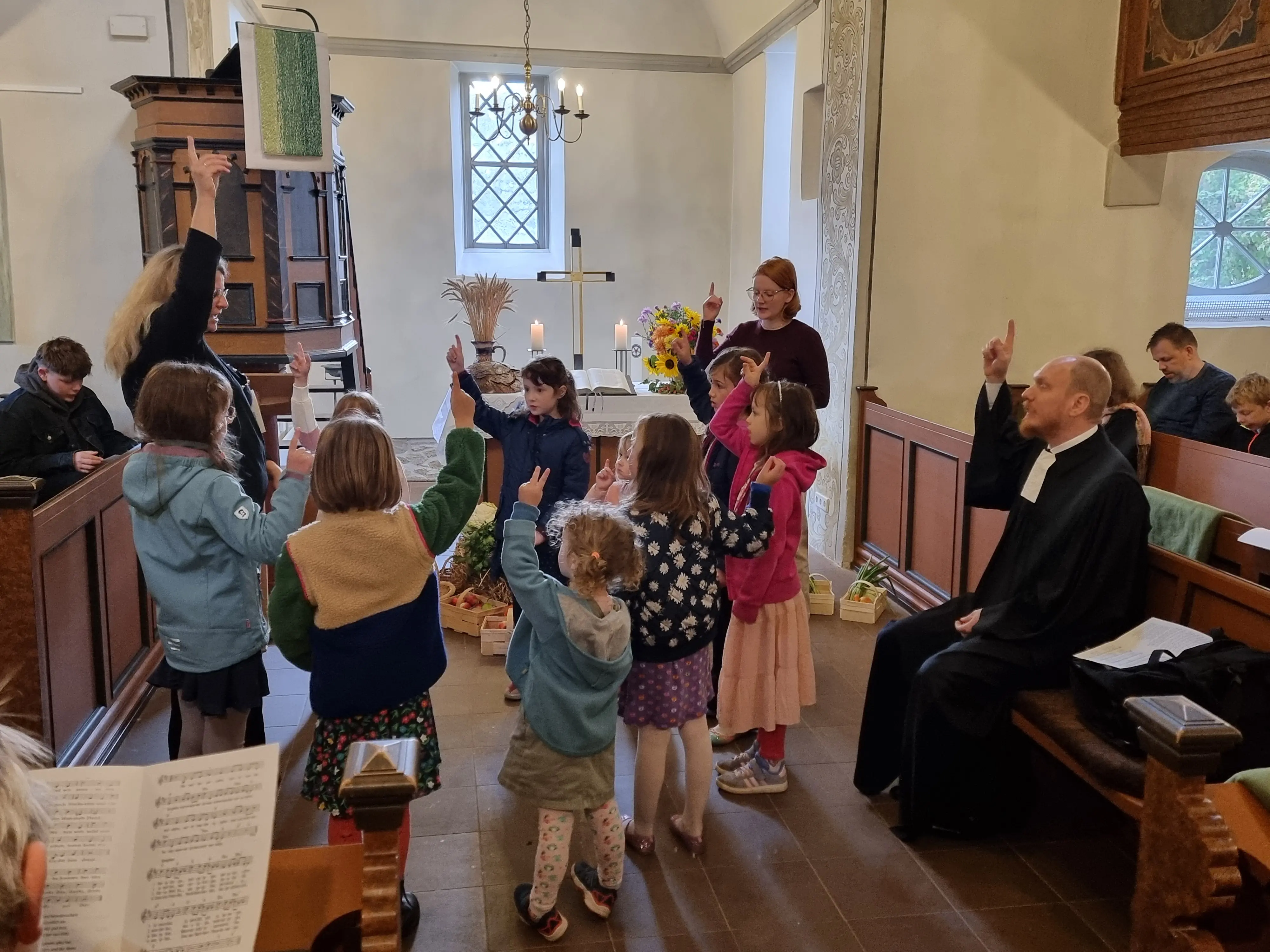 Aber von vorne: 11 Kinder zogen mit ihren Erntegaben zusammen mit Pfarrer Frederik Ebling und zwei Teamerinnen des Kindergottesdienstes in die gut besuchte Kirche ein. Die Kinder legten ihre Gaben am bereits schön geschmückten Altar ab. Den Refrain des ersten Lied „Wir pflügen und wir streuen“ begleiteten die Kinder mit Bewegungen. Statt einer Predigt kamen dann Pfarrer Valentino und ein Rabe als Handpuppen zum Einsatz. Der Rabe meckerte, dass er gar nicht danken brauche, denn Erdnüsse, das einzige, was ihm richtig gut schmecke, wären wieder einmal nicht bei den Erntegaben dabei. Die Äpfel seien sauer und wurmig, die Melone sei zu hart und dann erst der Bluemkohl! Niemand würde Blumenkohl mögen, behauptete er. Bei den meisten Kindern erntet er Zustimmung, aber einige Erwachsene outeten sich als Liebhaber. Der Rabe meinte nur kurz, dass es eben Menschen mit komischen Geschmack gäbe. Pfarrer Valentino bedauerte den Raben, weil er gar nicht merken würde, dass er für viele Sachen dankbar sein könne. Dankesagen sei Krafttraining für die Seele und es würde einem gleich viel besser gehen, wenn man sich in Erinnerung ruft, für was man alles dankbar sein könne. Und nach kurzem Nachdenken fielem dem Raben so viele Dinge ein, für die er danbar wäre, dass er kaum noch zu stoppen war.