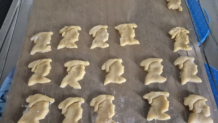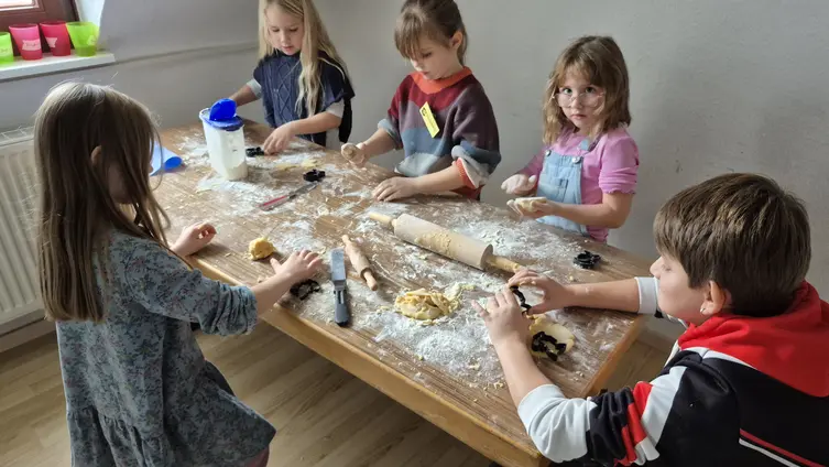 Sechs Kindergottesdienstmitarbeiterinnen hatten dann alle Hände voll zu tun, damit jedes Kind zum Mittagessen mit Nudeln, Tomatensauce, Käse und Getränk versorgt war. Während von den fleißigen Helferinnen aufgeräumt und gespült wurde, durften die Kinder im Untergeschoss des Gemeindehauses einen Zeichentrick-Lutherfilm ansehen. Danach wurde wieder gemeinsam gesungen und die abgekühlten Lutherkekse dienten als Nachtisch.